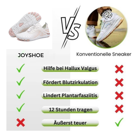 Fußdeformitäten wie Hallux Valgus oder Hammerzehen sind oft auf das Tragen falscher Schuhe zurückzuführen. Mit dem JoyShoe erhalten sie nicht nur maximale Bewegungsfreiheit, sondern auch Schutz für ihre Gelenke dank einer flachen, optimal dämpfenden Sohle.